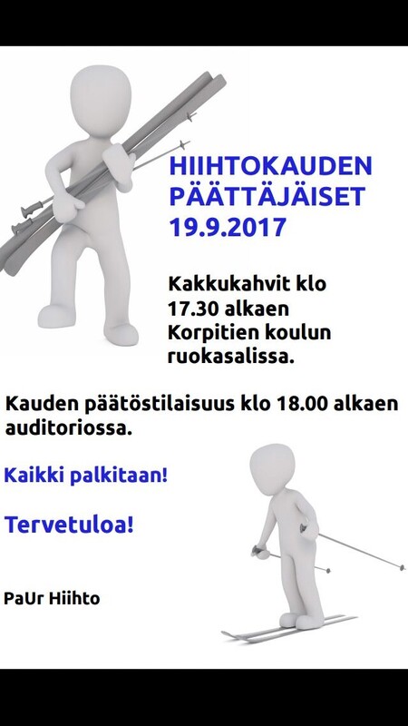 Hiihtokausi 2016-2017 on sivakoitu ja kesäkin on jo keretty harjoitella uutta kautta varten. Ettei uudet lumet ennätä vielä maahan niin on aika pitää hiihtokauden päätös ja muistaa sarjahiihtoihin ja kansallisiin kilpailuihin osallistuneita ahkeria hiihtäjiämme. Tilaisuudessa palkitaan kaikki sarjahiihtoihin osallistuneet hiihtäjät. Hiihtokauden 2016-2017 päätöstilaisuus Korpitien koululla 19.9.2017 kello 18.00. Tlaisuus alkaa 17.30 koulun ruokalassa kakkukahvilla ja jatkuu palkitsemisilla. |