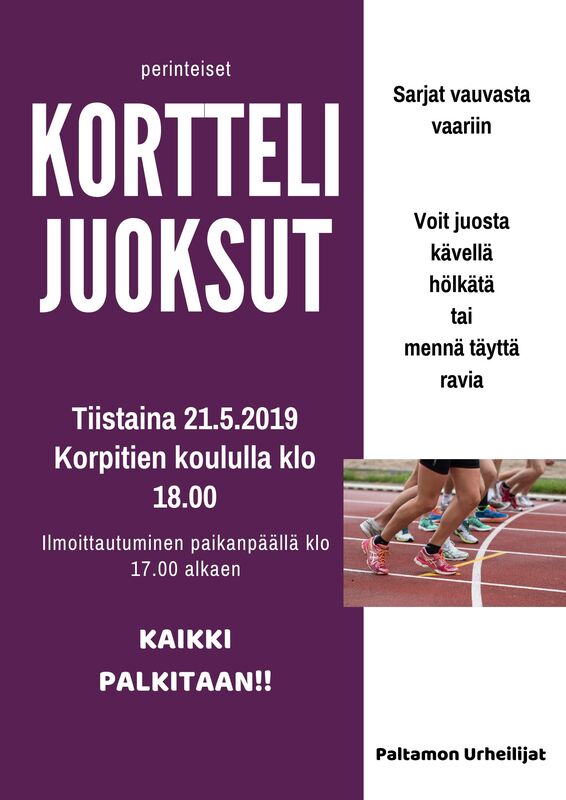 Tiistaina 21.5. juostaan Korpitien koulun ympäristössä Korttelijuoksut. Ilmoittautuminen alkaa klo 17.00 ja startti tapahtuu klo 18.00. Jokainen saa valita oman vauhtinsa itse. Voi juosta, kävellä, hölkätä tai mennä täyttä ravia koko matkan. Sarjat vauvasta vaariin. Kaikki osallistujat palkitaan jäätelöllä!!Tervetuloa kaikki innolla mukaan!!! |